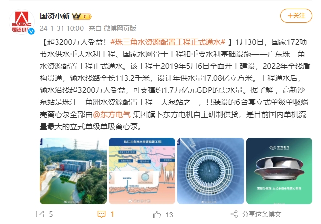 【超3200萬(wàn)人受益!#珠三角水資源配置工程正式通水#】1月30日,國(guó)家172項(xiàng)節(jié)水供水重大水利工程、國(guó)家水網(wǎng)骨干工程和重要水利基礎(chǔ)設(shè)施——廣東珠三角水資源配置工程正式通水。該工程于2019年5月6日全面開工建設(shè),2022年全線盾構(gòu)貫通,輸水線路全長(zhǎng)113.2千米,設(shè)計(jì)年供水量17.08億立方米。工程通水后,輸水沿線超3200萬(wàn)人受益,可支撐約1.7萬(wàn)億元GDP的需水量。據(jù)了解 ,高新沙泵站是珠江三角洲水資源配置工程三大泵站之一,其裝設(shè)的6臺(tái)套立式單級(jí)單吸蝸殼離心泵全部由@東方電氣集團(tuán)旗下東方電機(jī)自主研制供貨,是目前國(guó)內(nèi)單機(jī)流量最大的立式單級(jí)單吸離心泵。