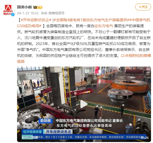 【#開年迎新訪名企#|#全國每4度電有1度由東方電氣生產裝備提供##中國爭氣機G50成功商用#】全國每四度電中,就有一度由@東方電氣集團生產的裝備提供。燃氣輪機被譽為裝備制造業皇冠上的明珠。不甘心于一顆螺釘都有可能受制于人,汶川地震中遭受重創的東方汽輪機廠,在尚未完成重建時便毅然開啟了自主燃機的研制。2023年,首臺全國產化F級50兆瓦重型燃氣輪機G50成功商用,被譽為中國“爭氣機”。中國東方電氣集團有限公司黨組書記、董事長俞培根表示,自主燃機的突破,為我國的供應鏈產業鏈自主可控提供了很大的支撐。