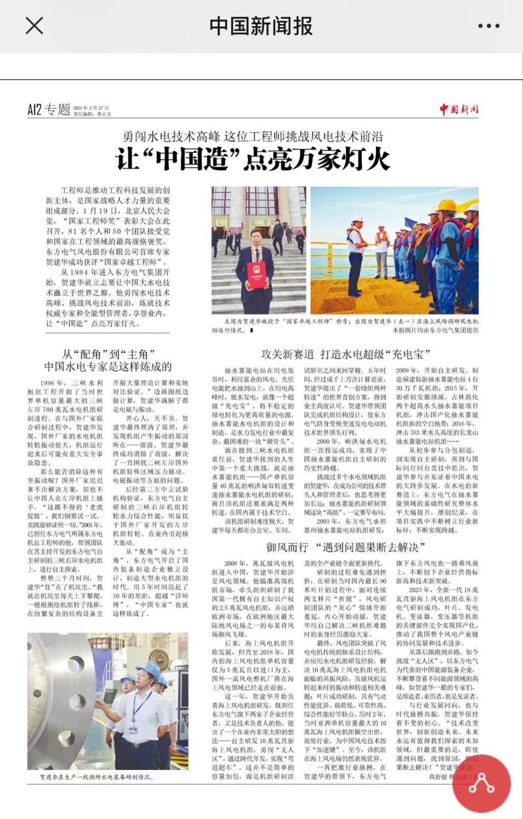 [中國新聞報]勇闖水電技術高峰 這位工程師挑戰風電技術前沿 讓“中國造”點亮萬家燈火