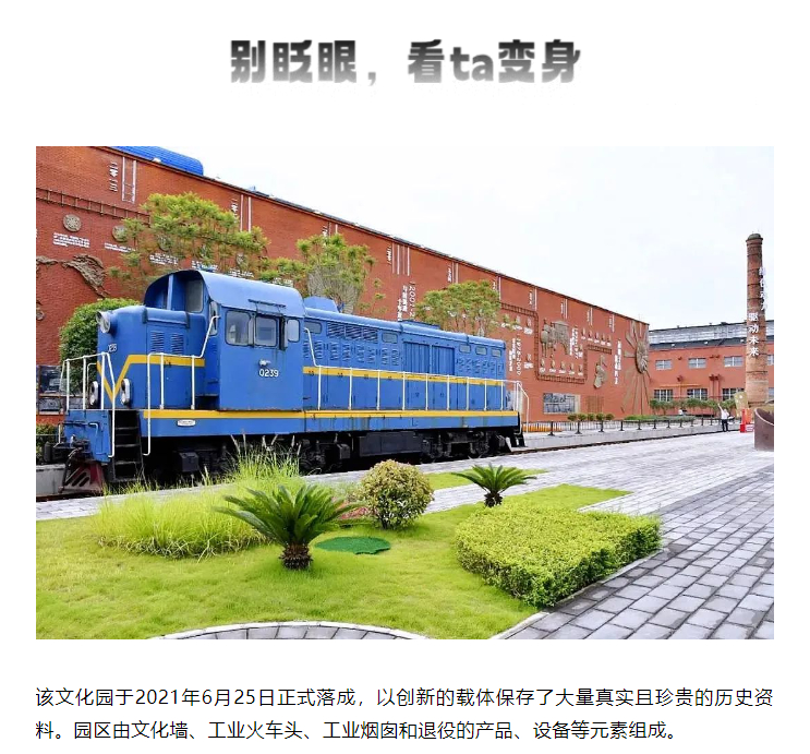 該文化園于2021年6月25日正式落成,以創新的載體保存了大量真實且珍貴的歷史資料。園區由文化墻、工業火車頭、工業煙囪和退役的產品、設備等元素組成。