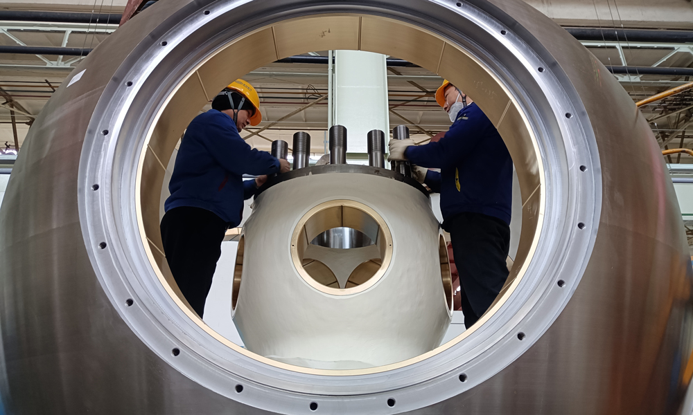 東方電氣集團工作人員在進行沙坪一級水電項目2號機組轉輪裝配。2025年以來,東方電氣已完成四川、安徽、內蒙古等省多個水電項目機組部件產出。