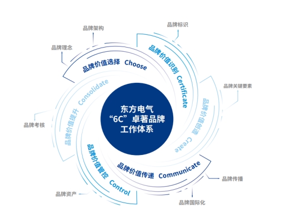 “6C”卓著品牌工作體系立足高端裝備制造行業(yè)實(shí)際,以實(shí)現(xiàn)“品牌卓著”為目標(biāo),聚焦東方電氣品牌價(jià)值,由品牌價(jià)值選擇(Choose)、品牌價(jià)值識(shí)別(Certificate)、品牌價(jià)值創(chuàng)造(Create)、品牌價(jià)值傳遞(Communicate)、品牌價(jià)值管控(Control)、品牌價(jià)值提升(Consolidate)六個(gè)部分組成,闡述展示企業(yè)從品牌價(jià)值選擇到識(shí)別、創(chuàng)造、傳遞、管控,推進(jìn)價(jià)值提升的螺旋進(jìn)階的邏輯過(guò)程,致力為“中國(guó)產(chǎn)品”向“中國(guó)品牌”躍升提供系統(tǒng)解決方案。