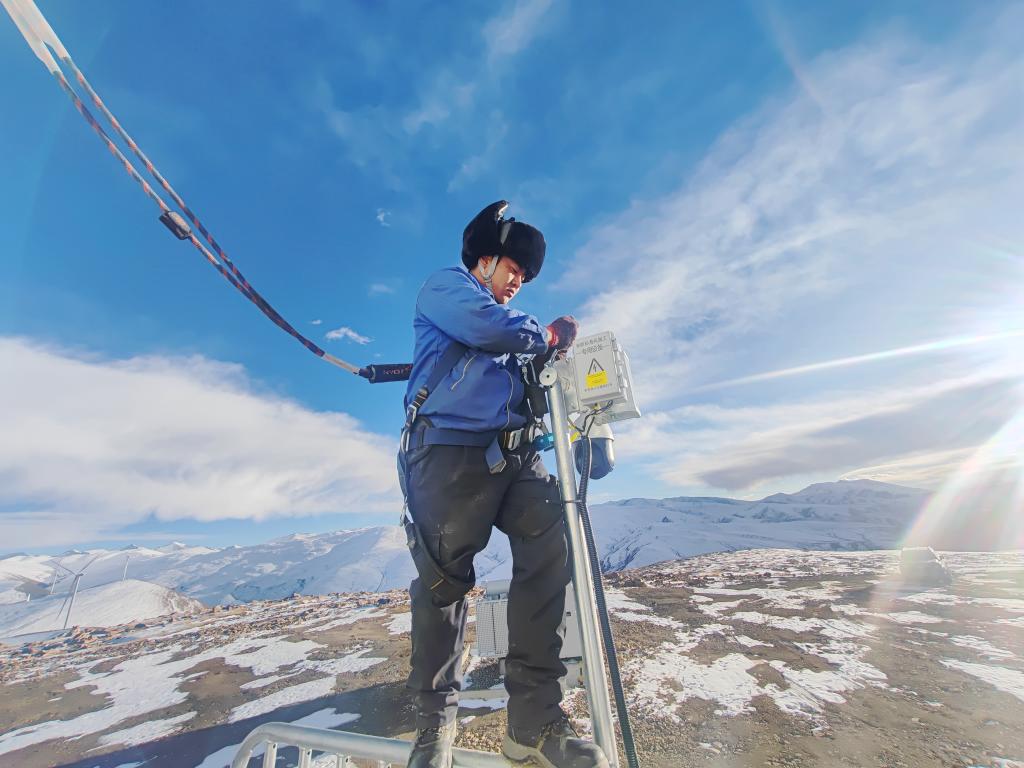 在位于喜馬拉雅山北麓的西藏日喀則市薩迦縣的薩迦風場,零下6度的環境下,東方風電安調員益西曲培正頂著寒風在塔基安裝風機攝像頭。