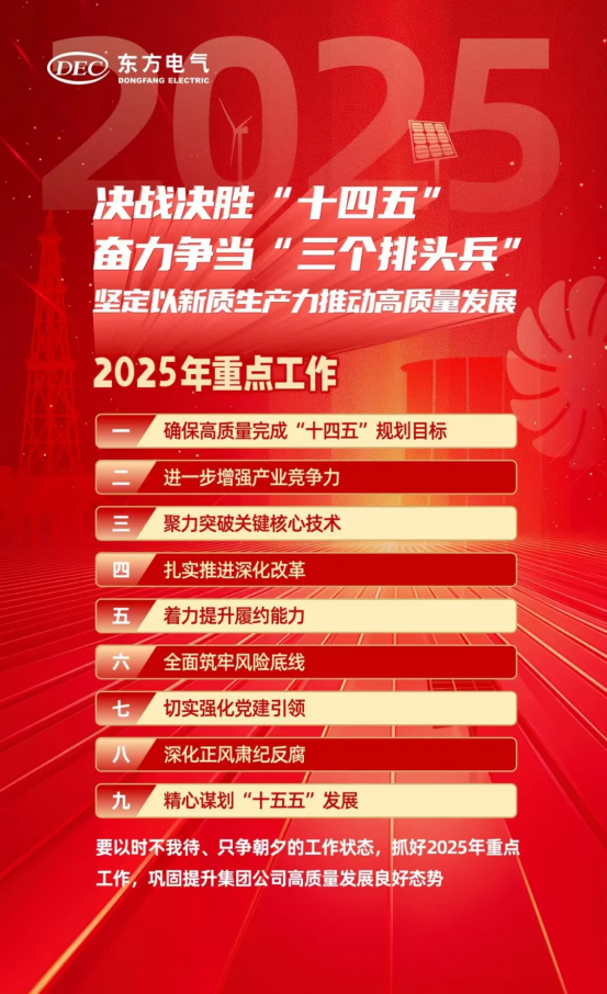 1月17日,東方電氣集團召開2025年度工作會議。會議以習近平新時代中國特色社會主義思想為指導,全面貫徹黨的二十大和二十屆二中、三中全會精神,認真落實中央經濟工作會議決策部署和中央企業負責人會議工作要求,全面總結集團公司2024年各項工作,系統部署2025年重點工作,動員全體干部職工持續落實“領先戰略”和“11256”發展戰略,加快建設具有核心競爭力的世界一流裝備制造集團。