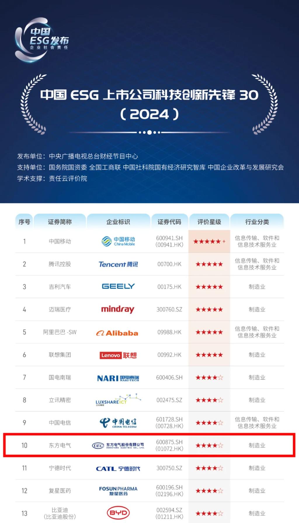 近日,由中央廣播電視總臺聯合國務院國資委、全國工商聯、中國社科院國有經濟研究智庫、中國企業改革與發展研究會等權威機構聯合推出的《科技創新ESG行動報告(2024)》正式發布。東方電氣憑借在科技創新和ESG(環境、社會和公司治理)領域的卓越表現,成功入選“中國ESG上市公司科技創新先鋒30(2024)”榜單,位列榜單第十位。