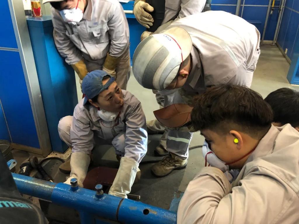 “火星飛濺到鞋子里時最難受,也不能挪動,鞋子勒得緊,只能等它自己降溫。” 即便穿著防護服、耐高溫鞋,焊工體感溫度依然達到45℃。“我用廢舊木架做了隔熱工裝,腳底就沒這么燙了,木架陪著我們焊了一臺又一臺,用到快散架了,大家還舍不得扔掉。”沒有先進經(jīng)驗可以借鑒,白映玉只能靠自己不斷摸索、不斷總結(jié)。“這條焊縫一次性焊接成功率低,主要原因是在高溫、狹小空間內(nèi)作業(yè),每一班要2個焊工輪著進去,每一次只能在筒內(nèi)待15到20分鐘,而每個人操作手法又不一樣。”找到了難點突破口,白映玉帶領(lǐng)團隊成員進行焊接前的風險防范,對工位、焊機、焊接參數(shù)和作業(yè)流程都制定了明確詳細的操作標準。