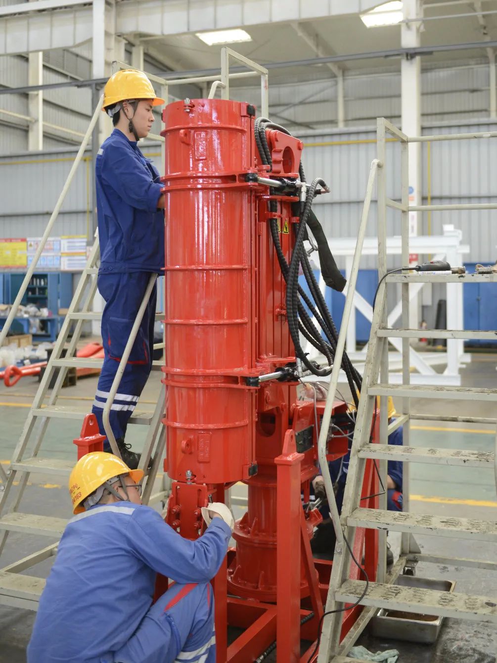 ◆東方宏華裝配人員正在進行鉆機自動化機具管線組裝工作