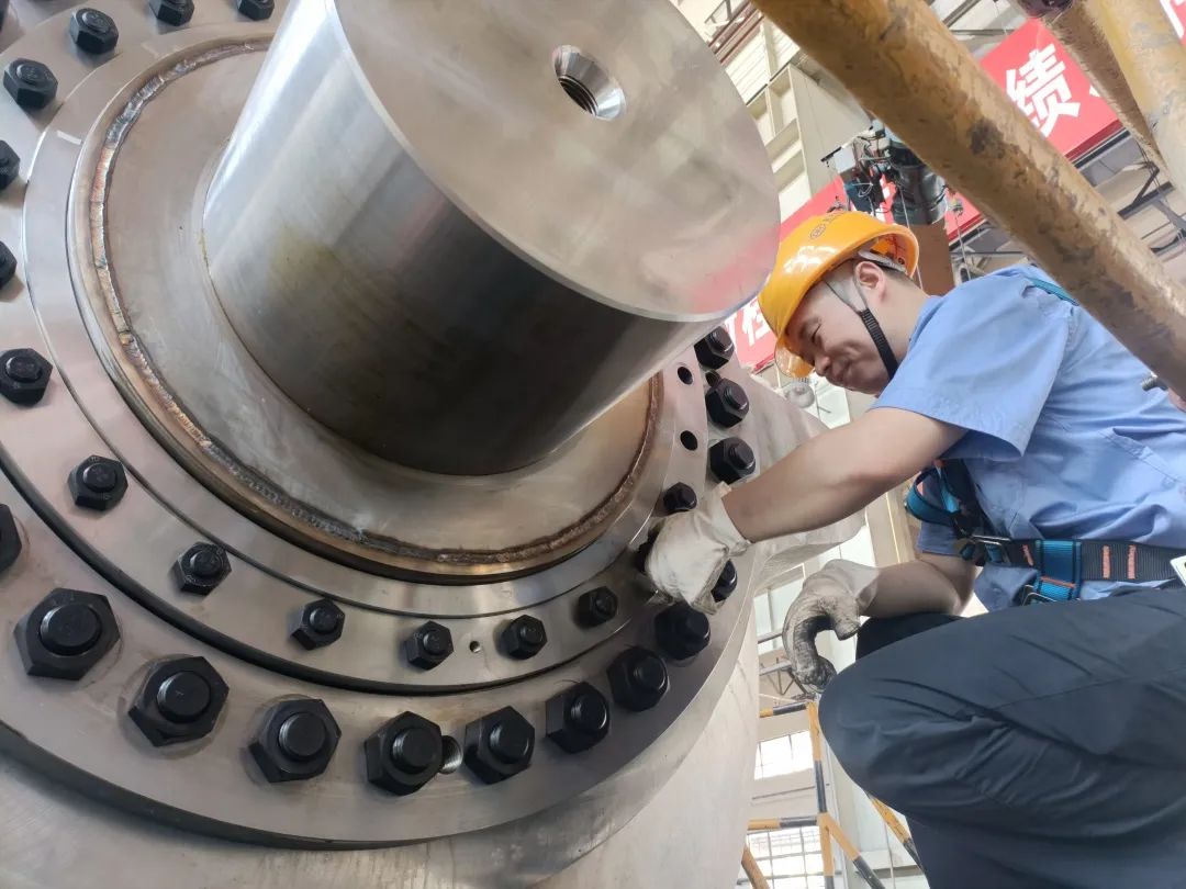 ◆東方電機水輪機分廠內,蟠龍3號機球閥軸端正在進行裝配作業