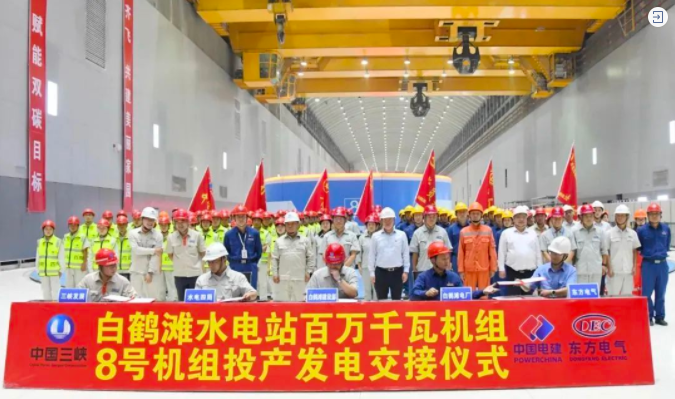 2022年9月22日,隨著8號機(jī)組完成72小時試運(yùn)行,金沙江白鶴灘水電站左岸全部8臺機(jī)組投產(chǎn)。至此,東方電氣白鶴灘項(xiàng)目研發(fā)制造、安裝服務(wù)任務(wù)圓滿收官。