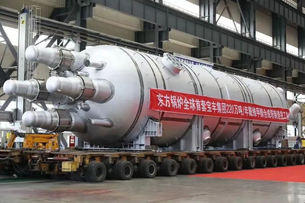 2019年,全球首套寧夏寶豐能源集團年產220萬噸戴維甲醇合成塔在東方鍋爐德陽制造基地完工發運。該甲醇合成塔是當時世界單套煤制甲醇產量最大的甲醇合成塔,也是戴維技術甲醇合成塔首次國產化。該產品的成功制造標志著,東方鍋爐在大型甲醇合成塔制造領域一舉打破了國外的壟斷地位,走在了世界的前列。該甲醇合成塔重達512噸,創造了東方鍋爐單臺套產品成套出廠噸位的歷史之最。