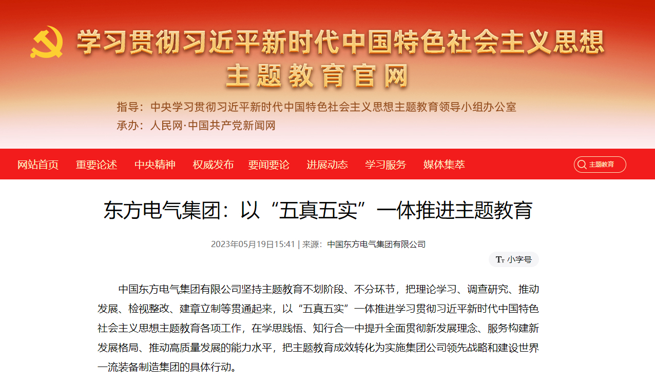 中國東方電氣集團有限公司堅持主題教育不劃階段、不分環(huán)節(jié),把理論學習、調(diào)查研究、推動發(fā)展、檢視整改、建章立制等貫通起來,以“五真五實”一體推進學習貫徹習近平新時代中國特色社會主義思想主題教育各項工作,在學思踐悟、知行合一中提升全面貫徹新發(fā)展理念、服務構(gòu)建新發(fā)展格局、推動高質(zhì)量發(fā)展的能力水平,把主題教育成效轉(zhuǎn)化為實施集團公司領先戰(zhàn)略和建設世界一流裝備制造集團的具體行動。