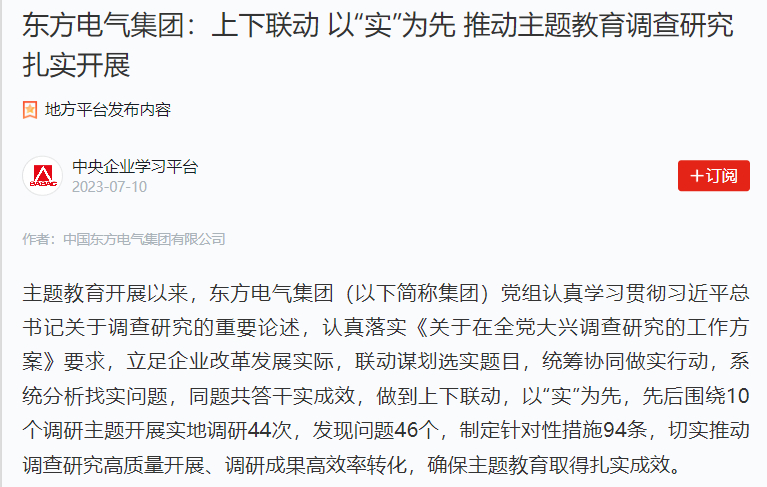 主題教育開展以來,東方電氣集團(以下簡稱集團)黨組認真學習貫徹習近平總書記關于調查研究的重要論述,認真落實《關于在全黨大興調查研究的工作方案》要求,立足企業改革發展實際,聯動謀劃選實題目,統籌協同做實行動,系統分析找實問題,同題共答干實成效,做到上下聯動,以“實”為先,先后圍繞10個調研主題開展實地調研44次,發現問題46個,制定針對性措施94條,切實推動調查研究高質量開展、調研成果高效率轉化,確保主題教育取得扎實成效。