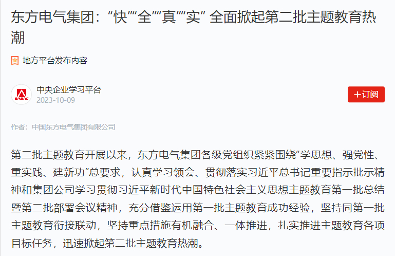 第二批主題教育開展以來,東方電氣集團各級黨組織緊緊圍繞“學(xué)思想、強黨性、重實踐、建新功”總要求,認真學(xué)習(xí)領(lǐng)會、貫徹落實習(xí)近平總書記重要指示批示精神和集團公司學(xué)習(xí)貫徹習(xí)近平新時代中國特色社會主義思想主題教育第一批總結(jié)暨第二批部署會議精神,充分借鑒運用第一批主題教育成功經(jīng)驗,堅持同第一批主題教育銜接聯(lián)動,堅持重點措施有機融合、一體推進,扎實推進主題教育各項目標任務(wù),迅速掀起第二批主題教育熱潮。