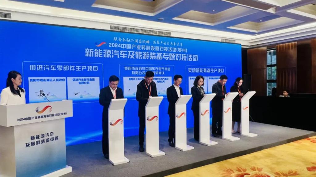 2024中國產業(yè)轉移發(fā)展對接活動(貴州)以“服務和融入國家戰(zhàn)略 共贏產業(yè)發(fā)展新未來”為主題,包括1場綜合活動和4場專題活動,圍繞資源精深加工及綜合利用、先進裝備制造、大數(shù)據(jù)電子信息、特色輕工等貴州特色優(yōu)勢產業(yè),開展地市推介、政企對接、實地考察、專家解讀、項目簽約等。在新能源汽車及旅游裝備專題對接活動中,東方電氣集團與貴陽市人民政府簽署了戰(zhàn)略合作框架協(xié)議。