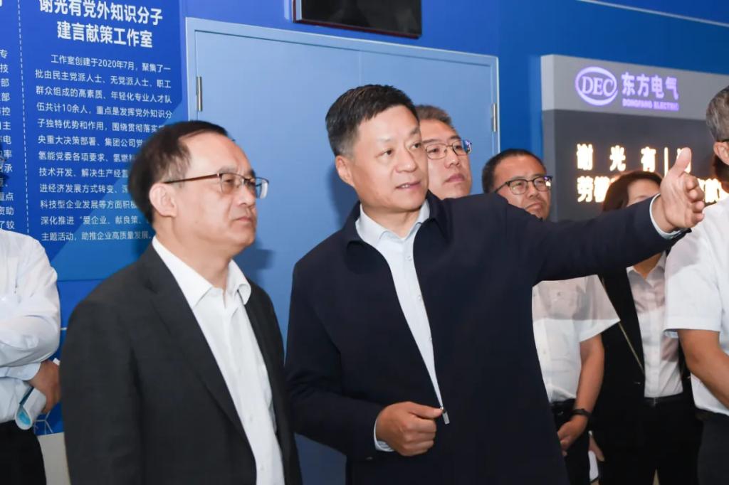 在俞培根的陪同下,段向東一行參觀了東方電氣科技展示廳、氫能產線,深入了解東方電氣集團的發展歷程、產業規劃與布局、科技創新等情況。