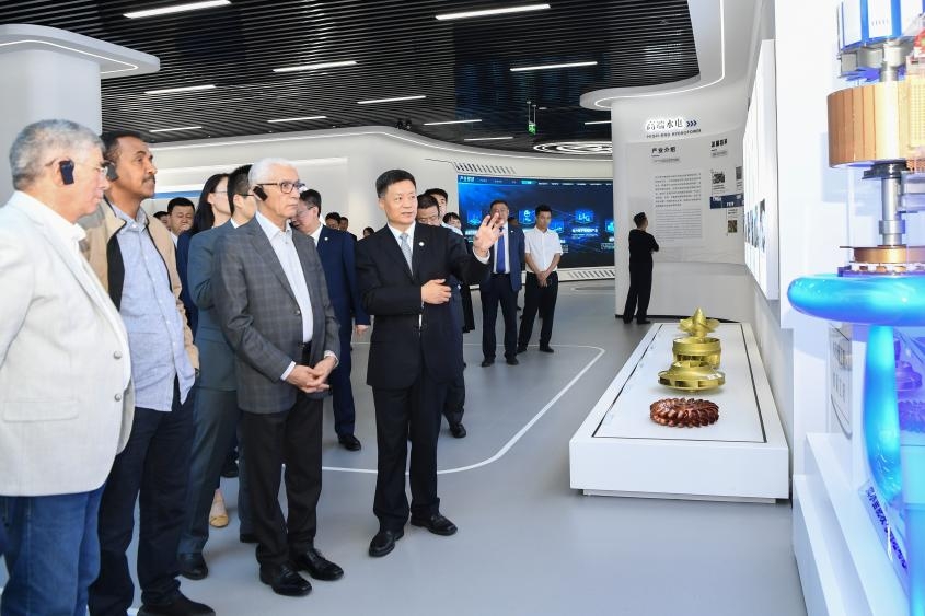 在俞培根等陪同下,阿拉米一行參觀了東方電氣科技展示廳,詳細了解東方電氣集團科技創(chuàng)新、綠色裝備制造、共建“一帶一路”等方面情況。阿拉米對東方電氣集團在能源領(lǐng)域所取得的成就表示祝賀。