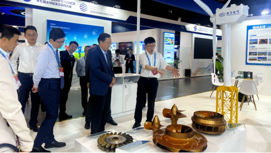 本屆大會,東方電氣集團展臺通過“六電六業”及“鏈動全球”展示模塊,集中呈現了近年來研制的高端清潔能源裝備在構建新型能源網絡中作出的積極貢獻、在全球能源互聯網領域取得的最新成果。在東方電氣集團展臺,自主研制的500兆瓦沖擊式水電轉輪、26兆瓦級海上風電機組等創新產品模型吸引了津巴布韋、多米尼加等國家眾多專業觀眾。