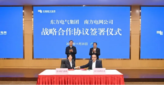 11月20日,中國(guó)東方電氣集團(tuán)有限公司與中國(guó)南方電網(wǎng)有限責(zé)任公司在廣州簽署戰(zhàn)略合作協(xié)議。東方電氣集團(tuán)黨組書(shū)記、董事長(zhǎng)羅乾宜,南方電網(wǎng)公司黨組書(shū)記、董事長(zhǎng)孟振平,共同見(jiàn)證協(xié)議簽署。集團(tuán)公司黨組成員、總會(huì)計(jì)師呂雙與南方電網(wǎng)公司黨組成員、副總經(jīng)理吳小辰代表雙方簽訂協(xié)議。
