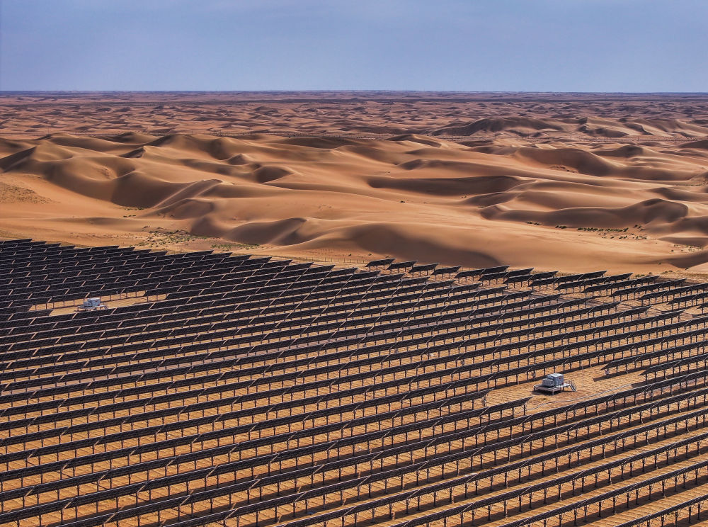 ??這是2025年6月5日拍攝的位于內蒙古巴彥淖爾市磴口縣的烏蘭布和東北部新能源基地100萬千瓦光伏先導工程項目(無人機照片)。該項目地處烏蘭布和沙漠。新華社記者 連振 攝